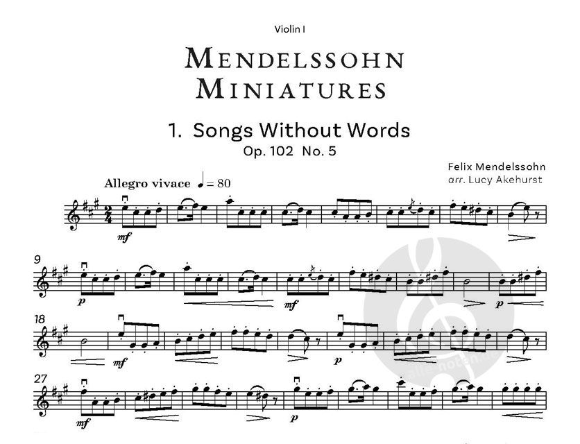Three Songs Without Words für zwei Violinen und Klavier mit optionalem Cello, arrangiert von Lucy Akehurst. Inhalt (in aufsteigender Reihenfolge der Schwierigkeit): No. 1: Opus 102 Nr. 5; No. 2: Opus...
