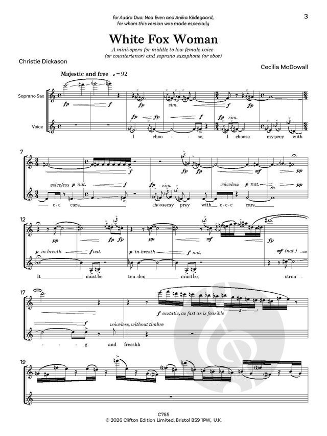 White Fox Woman ist eine eindrucksvolle neunminütige Mini-Oper für mittlere bis tiefe Stimme, die entweder von Sopransaxofon oder Oboe begleitet wird. Dieses fesselnde Werk wurde 2002 von dem Oboisten...