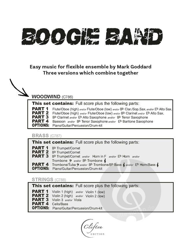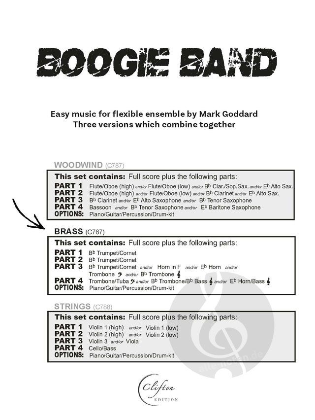 Boogie Band enthält 3 einfache Boogie-Stücke - ideal für Anfänger - mit optionalen Schlagzeug-, Percussion-, Keyboard- und Gitarren-Akkordsymbolen für flexibles Musizieren in der Gruppe, erhältlich in...