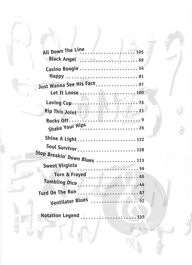 18-song matching folio to the classic Stones album features transcriptions of: Rocks Off - Tumbling Dice - Let It Loose - All Down The Line - Stop Breaking Down - Casino Boogie - Torn & Frayed - Black...