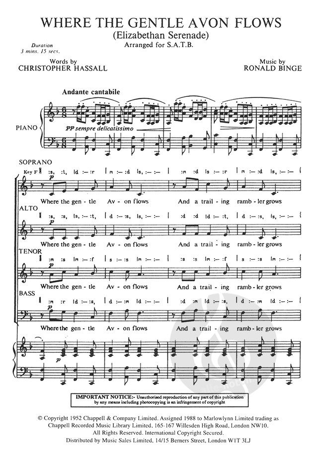 Where The Gentle Avon Flows' arranged for mixed voice choir SATB with piano accompaniment.