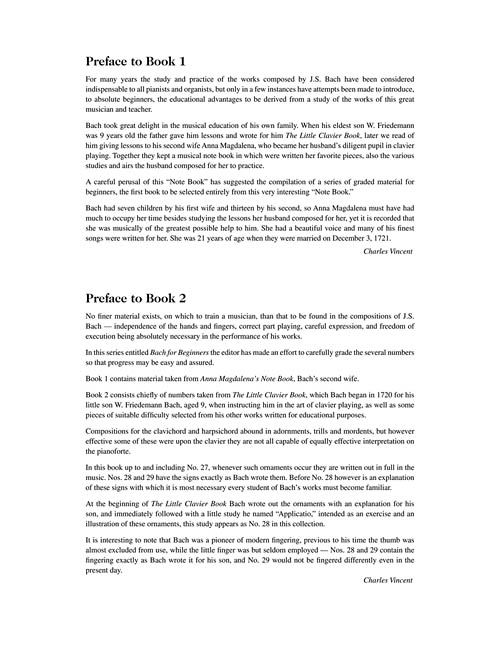 29 Stücke, u. a. eine Auswahl aus dem Notenbüchlein für Anna Magdalena, dem Klavierbüchlein und anderen geeigneten Werken für Klavieranfänger. Enthält die Originalvorworte zu Bach for Beginners - Book...