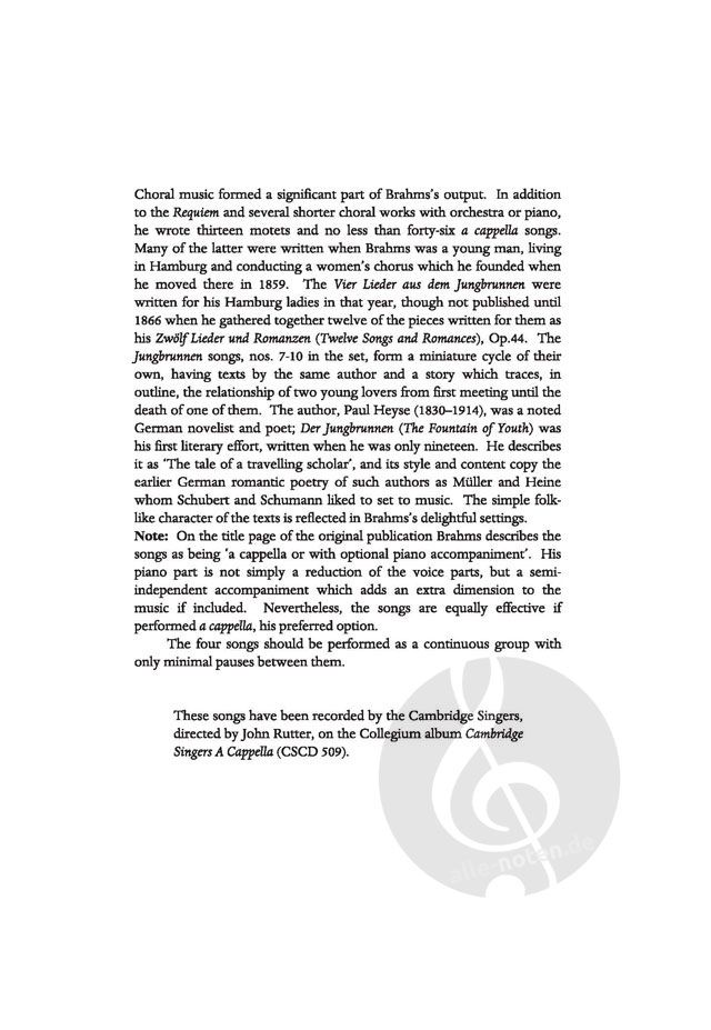 For SATB with optional piano. These four masterfully crafted songs by Brahms (edited by Rutter) feature the original German words as well as an optional English translation, provided by Rutter himself...