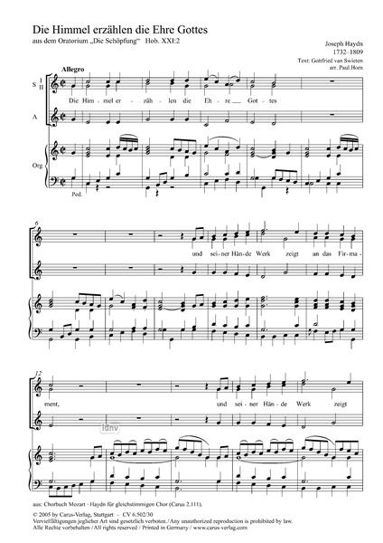 The joyous Chorus The Heavens Are Telling The Glory of God completes the first movement of Haydn's masterpiece The Creation. Here the movement is arranged as an anthem for treble Voices SSA with soli...
