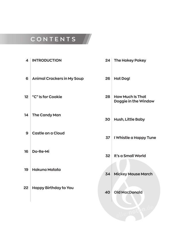 Five-finger arrangements of the themes for: Barney - Bob the Builder - Thomas the Tank Engine - Dragon Tales - PB&J Otter - SpongeBob SquarePants - Rugrats - Dora the Explorer.