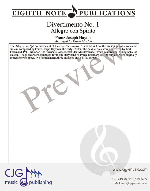 Der Satz Allegro con Spirito des Divertimento Nr. 1 stammt aus den Sechs Feldpartiten, die Haydn in den frühen 1780er Jahren komponierte. Ursprünglich für zwei Oboen, zwei Hörner, drei Fagotte und ein...