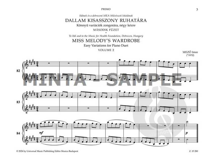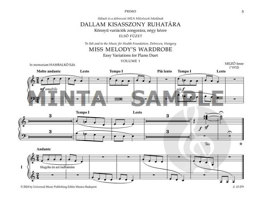 Imre Mező (geb. 1932) komponierte mehrere populäre Werke für Kinder und junge Leute, die Musik studieren. Sein Satz von leichten Variationen "Miss Melody's Wardrobe", ursprünglich für Klavier solo (Z....