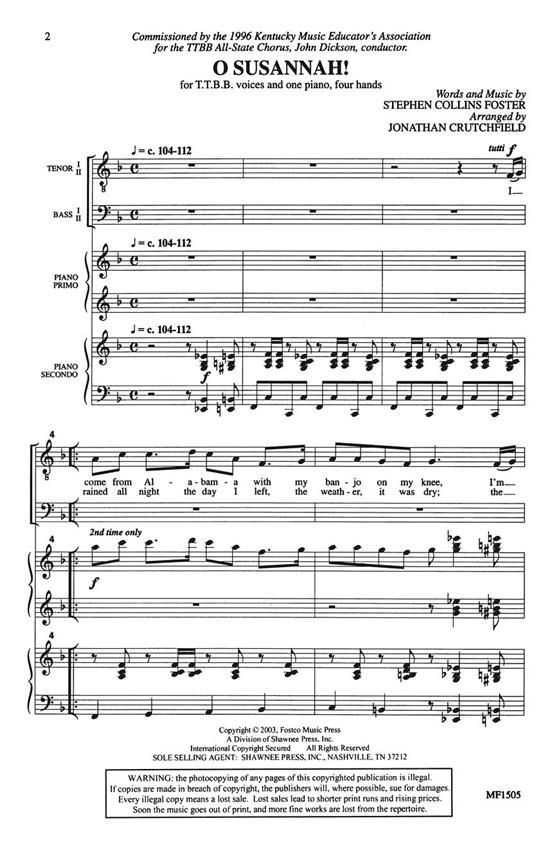 Commissioned for the Kentucky Music Educator's Association TTBB All-State Chorus, this lively arrangement of a beloved folk song also features piano, four-hand accompaniment. O Susannah!, with its won...
