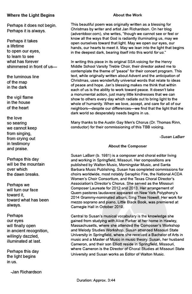 Uses: Concert, General, Peace Sunday Scripture: Proverbs 16:7, Colossians 3:15, Hebrews 12:14, James 3:18 The familiar Latin text Dona Nobis Pacem is set here with great beauty. This is a timeless pie...