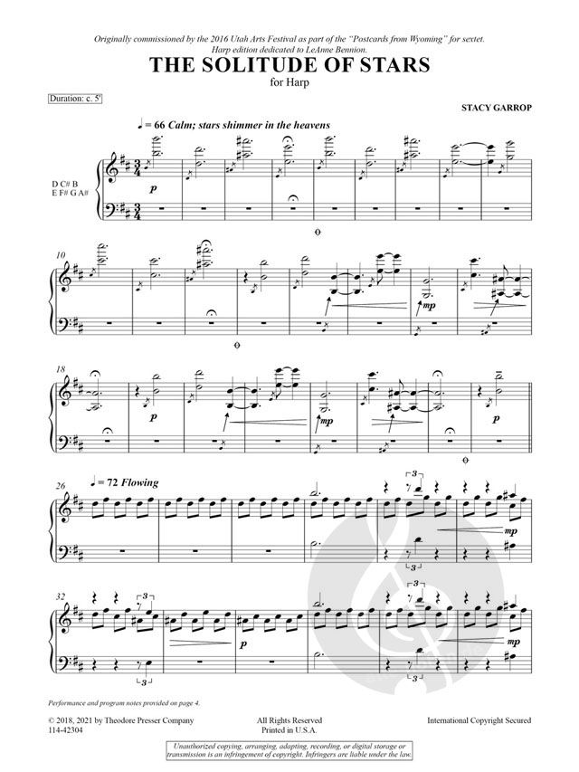 THE SOLITUDE OF STARS is a 5-minute work for solo harp. It depicts the composer's awe at experiencing a nighttime view of the starry heavens; shining brightly over the vast expanse of the Wyoming prai...