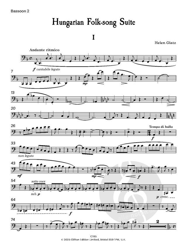 Eine dreisätzige Suite für 2 Fagotte und Klavier von Helen Glatz: 1908-1996. Die Ungarische Volksliedsuite entstand aus dem Gefühl von Helen Glatz, dass es einen Bedarf an mehr Originalmusik für Fagot...