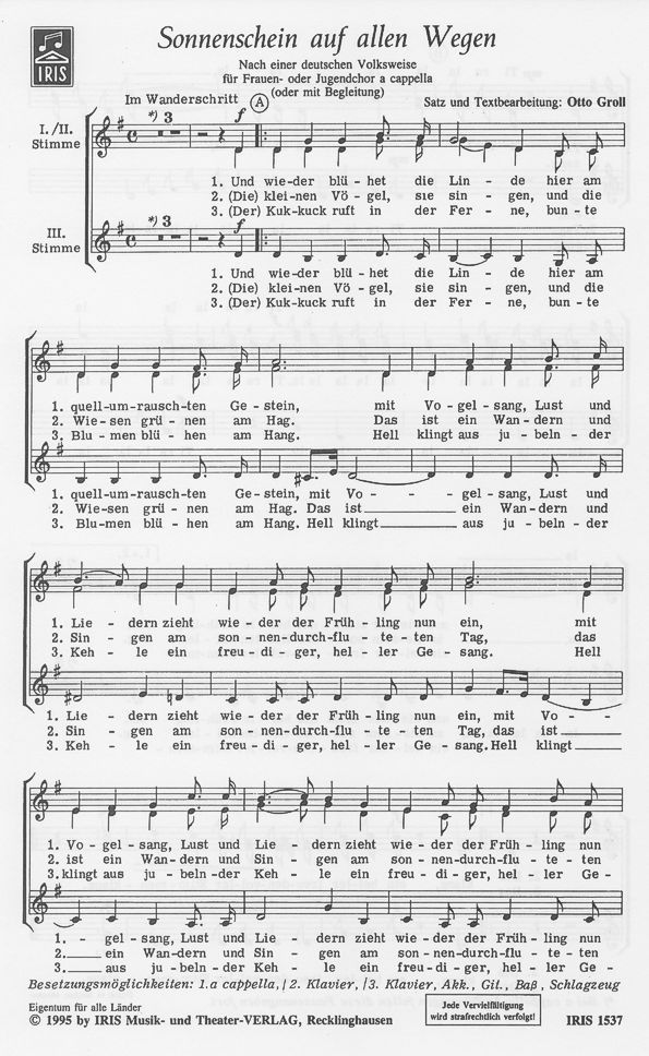 Für Frauen- oder Jugendchor a cappella oder mit Klavier oder kleinem bzw. großem Orchester. Satz: Otto Groll.