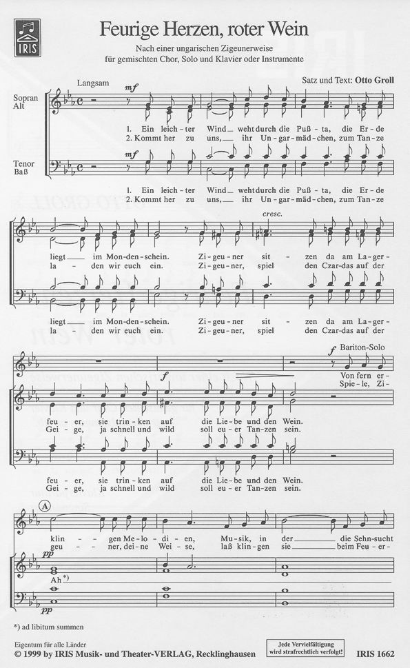 Nach einer ungarischen Volksweise für 3stg. Chor, Solo und Klavier oder zus. mit Akk., Gitarre, Bass, Schlagwerk