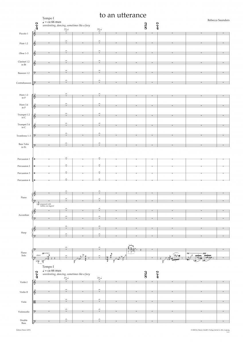 to an utterance von Rebecca Saunders ist ein 28-minütiges Werk für Klavier solo und Orchester mit folgender Besetzung: 3(1/2,Picc/3,Picc).3.3(1/2,BCl/3,BCl,CbCl).3(1/2/Cbsn) - 4.4.3.1 - 4-8Perc - Pf -...