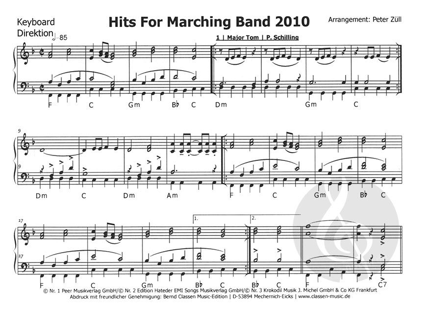 Die 'Hits For Marching Band 2010' beinhalten drei Klassiker aus der Zeit der Neuen Deutschen Welle: Major Tom... Völlig losgelöst von Peter Schilling, 99 Luftballons von Nena und Sternenhimmel von Hub...