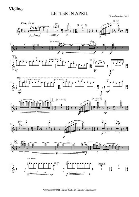 For clarinet, violin, cello and piano. In Danish: BREV I APRIL. Score: WH31345