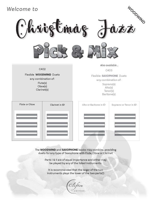Sieben aufgepeppte Weihnachtsmelodien. Die Bücher WOODWIND und SAXOPHONE können kombiniert werden und bieten Duette für jede Art von Saxophon mit Flöte, Oboe oder Klarinette. Die Teile I und II sind g...