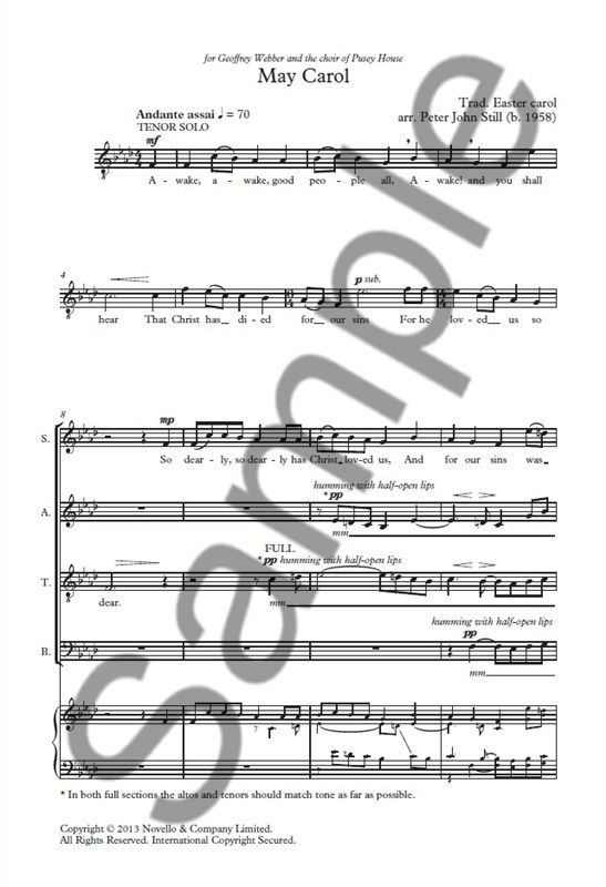 May Carol is a work by Peter John Still for Unaccompanied SATB Choir. It lasts around 2 minutes.