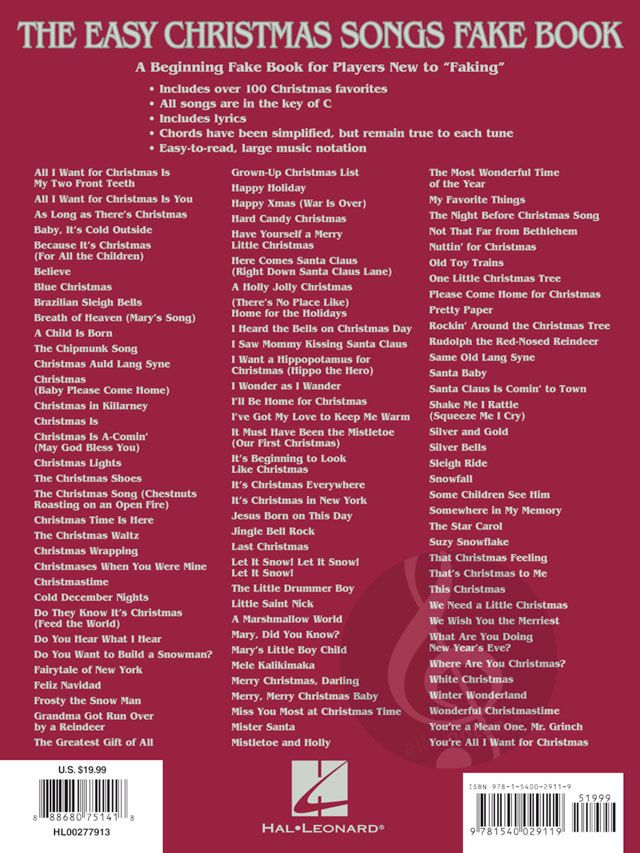 100 contemporary holiday hits in the popular Easy Fake Book format are presented in this book featuring large, easy-to-read notation, simplified harmonies and melodies, lyrics, and easy stay-open bind...
