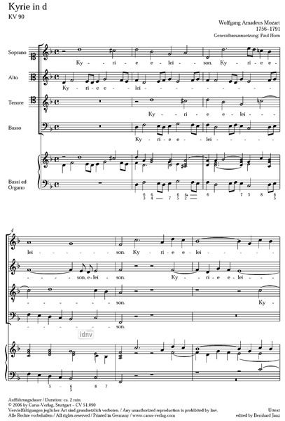 Coro SATB, 2 Ob, 2 Fg, 2 Ctr, Timp, 2 Vl, Va, Bc Sprache: lateinisch Fragment, ergänzt von Maximilian Stadler - Die beiden Kyrie-Vertonungen in Es KV 322 (1778/79) und in C KV 323 (wohl nicht vor 1790...