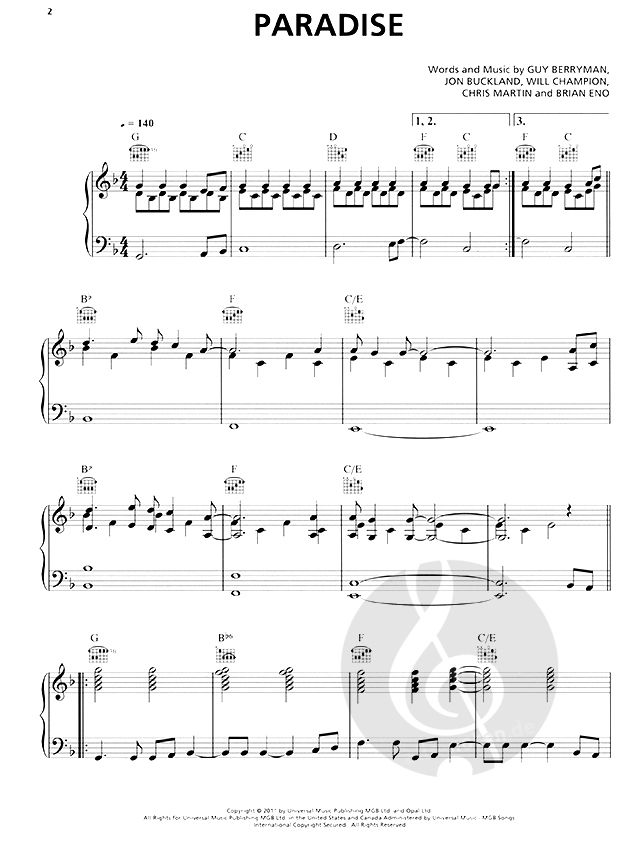 Einzelausgabe (Noten für Klavier, Gesang und Gitarre) von Paradise von Coldplay.