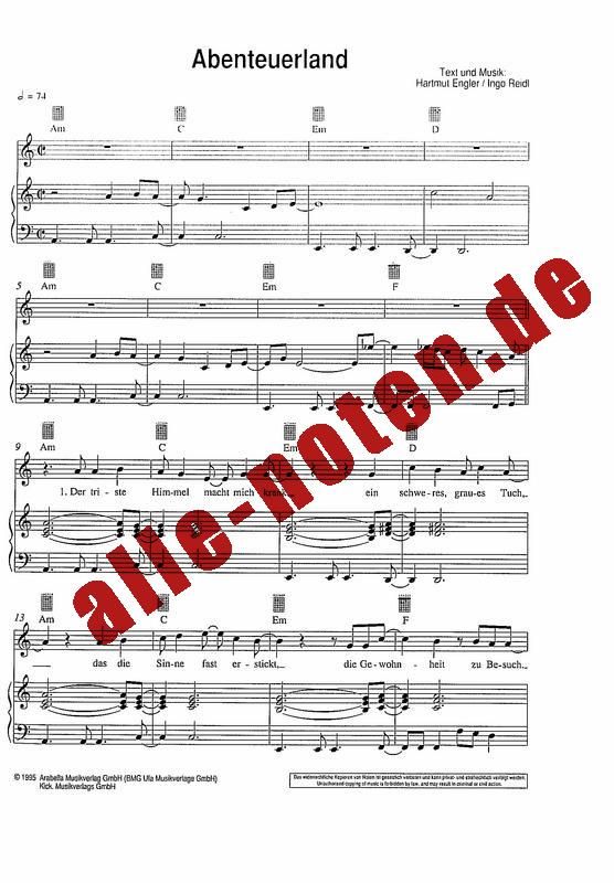 Alle Songs, der CD, arrangiert für Klavier, Gitarre & Gesang: Abenteuerland - Dass es dir leid tut - Ein graues Haar - Es tut weh - Ganz egal - Ich lieb Dich (egal, wie das klingt) - In Gedanken - Le...