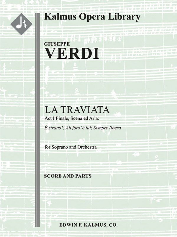 La Traviata (Die gefallene Frau) basiert auf La Dame aux camélias (1852), einem Theaterstück nach dem Roman von Alexandre Dumas fils. Die Oper trug ursprünglich den Titel Violetta, nach der Hauptfigur. Piave und Verdi wollten Dumas folgen und die Oper in der Gegenwart spielen lassen, aber die Behörden von La Fenice bestanden darauf, dass die Oper in der Vergangenheit, um 1700, spielen sollte. Erst in den 1880er Jahren wurden die ursprünglichen Wünsche des Komponisten und des Librettisten umgesetzt und "realistische" Aufführungen inszeniert. La Traviata erfreut sich großer Beliebtheit und ist eine der meistgespielten Opern überhaupt. Dieser Ausschnitt vom Ende des 1. Aktes gehört zu den bekanntesten der Oper, in dem Violetta sich fragt, ob Alfredo ihre einzige große Liebe sein könnte (È strano!... Ah, fors' è lui - "Ah, vielleicht ist er der Eine"), aber beschließt, dass sie ihre Freiheit braucht (Sempre libera - "Immer frei.") Besetzung: 2+Picc.2.2.2: 4.2.3.1: Hp: Str (4-4-3-3-3 im Satz): Solostimme.