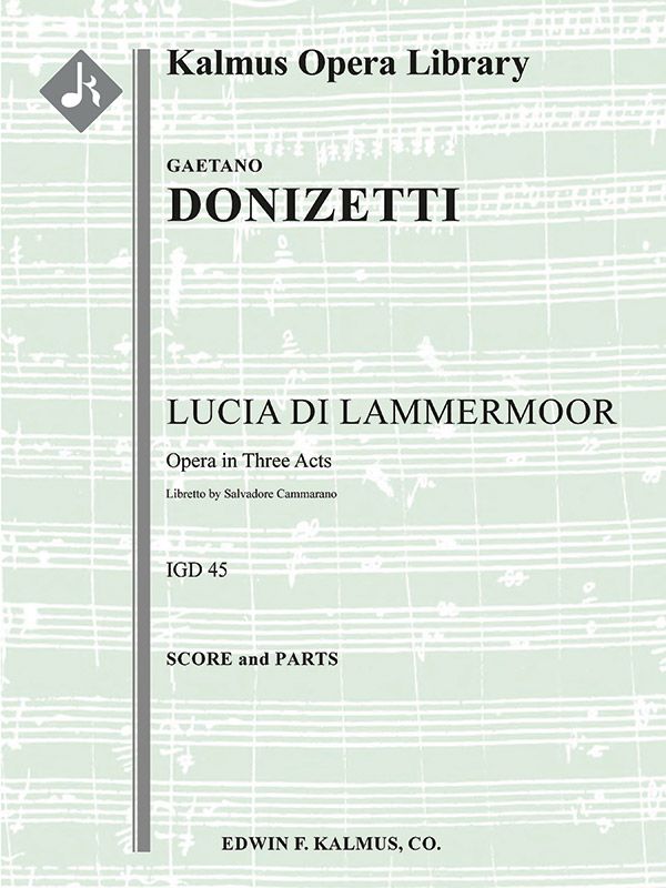 Lucia di Lammermoor ist ein Dramma tragico in drei Akten von Gaetano Donizetti. Salvadore Cammarano schrieb das Libretto in italienischer Sprache auf der Grundlage von Sir Walter Scotts historischem Roman The Bride of Lammermoor von 1819. Donizetti schrieb Lucia di Lammermoor 1835, kurz nachdem Gioachino Rossini in den Ruhestand getreten und Vincenzo Bellini gestorben war, so dass er der einzige noch tätige italienische Opernkomponist von Rang war. Dies und das Interesse an der Kultur und Geschichte Schottlands, die im Mittelpunkt der Geschichte stehen, führten zu einem stetigen Erfolg des Werks. Es wurde am 26. September 1835 im Teatro di San Carlo in Neapel uraufgeführt. Diese Ausgabe enthält einige neu gestochene Banda-Stimmen, um ein einheitliches und leicht zu handhabendes Material für die Aufführung zu schaffen. Instrumentation: 2+Picc(dFl).2.2.2: 4.2.3.0: Timp.Perc(3-4): Hp: Str (4-4-3-3-3 im Satz): Banda: Vokalsoli (7 Rollen SATTTBB): Chor.