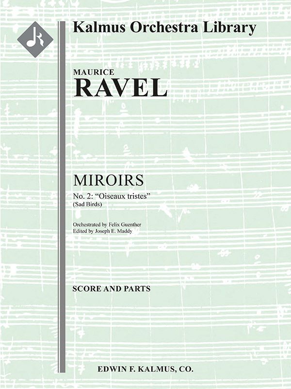 MIROIRS ("Mirrors") ist eine ursprünglich von Maurice Ravel (1875-1937) geschriebene fünfsätzige Suite für Klavier solo, die zwischen 1904 und 1905 entstand und in der jeder Satz einem Mitglied der französischen Avantgarde-Künstlergruppe Les Apaches gewidmet ist. Ravel orchestrierte später sowohl den dritten Satz mit dem Titel "Une barque sur l'océan" ("Ein Boot auf dem Ozean" - Paul Sordes gewidmet) als auch den vierten Satz mit dem Titel "Alborada del gracioso" ("Die Aubade des Narren" - Michel-Dimitri Calvocoressi gewidmet) selbst. Ernesto Halffter orchestrierte später den fünften Satz ("La vallée des cloches" - "Das Tal der Glocken" - Maurice Delage gewidmet), ebenso wie Percy Grainger, während Felix Günther den zweiten Satz ("Oiseaux tristes" - "Traurige Vögel" - Ricardo Viñes gewidmet) instrumentierte. Die Orchestrierung des ersten Satzes ("Noctuelles" - "Motten" - Léon-Paul Fargue gewidmet) ist jüngeren Datums. Diese Orchestrierung von "Oiseaux Triste" (Traurige Vögel) wurde von Felix Guenther arrangiert und von Joseph Mady bearbeitet. Guenther hat verschiedene Besetzungsoptionen angeboten, um Flexibilität für kleinere Ensembles zu ermöglichen. Besetzungen: Kleines Orchester: 1.0.1.0: 3Sax(AAT): 0.2.0.0: Perc(1): Str (7 Pts:5/5/4/4-7-6-5 im Satz); Großes Orchester: 2.2.2.2: 3Sax(AAT): 2.2.0.0: Perc(1): Hp: Str (7 Pkt:5/5/4/4/4-7-6-5 im Satz).