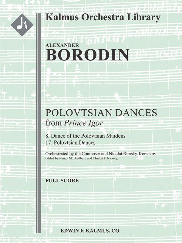 Diese berühmteste Version der Polowetzer Tänze (oder Polewetzer Tänze) stammt vom Ende des zweiten Akts von Borodins Oper Fürst Igor, die zum Zeitpunkt des Todes des Komponisten 1887 unvollendet blieb, und wurde von Nikolai Rimski-Korsakow orchestriert. Die Musik enthält zwar Chor-/Gesangspartien, doch werden diese oft weggelassen, wenn das Werk als Orchesterstück aufgeführt wird. Die vorliegende Ausgabe wurde von Nancy M. Bradburd und Clinton F. Nieweg herausgegeben. Instrumentierung: 2+1.2(2dEH).2.2: 4.2.3.1: Timp.Perc(4-5): Hp: Str(9-8-7-6-5 im Satz): (Mix Chor).