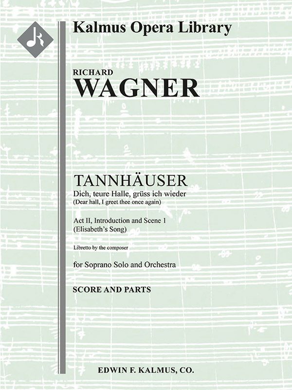 Tannhäuser, eine Oper in drei Akten aus dem Jahr 1845 von Richard Wagner (1813-1883), verbindet zwei deutsche Legenden: den mythologisierten mittelalterlichen deutschen Minnesänger und Dichter und die Geschichte des Wartburg-Liederwettbewerbs. Wie in vielen Werken Wagners geht es in der Geschichte um den Konflikt zwischen heiliger und profaner Liebe sowie um die Erlösung durch die Liebe. Die Uraufführung fand am 19. Oktober 1845 im Königlichen Hoftheater Dresden statt, und diese Ausgabe von 1845 wird als "Dresdner Fassung" bezeichnet. Für eine Aufführung am 13. März 1861 an der Pariser Opéra wurde eine stark überarbeitete Fassung erstellt, die Wagner jedoch aufgrund des Gejohle des sehr kritischen Publikums nach nur drei Aufführungen zurückzog. Weitere Überarbeitungen der Pariser Fassung wurden 1875 vorgenommen, um die "Wiener Fassung" zu schaffen, einschließlich einer Rückkehr zum Deutschen statt zum Französischen, und es ist diese aktualisierte Version der Pariser Fassung, die heute am häufigsten verwendet wird. Die gesamte Oper bleibt ein wichtiger Bestandteil des Opernrepertoires. "Dich, teure Halle, grüß ich wieder" erklingt in der Eröffnungsszene des zweiten Aktes. Es wird von Elisabeth gesungen, die ihre Traurigkeit über die Abreise Tannhäusers zum Ausdruck bringt, sich aber über seine Rückkehr und die Lieder, die er singen wird, freut. Besetzung: 2.2.2.2: 4.0.0.0: Str (4-4-3-3-3 im Satz): Solo-Sopran.