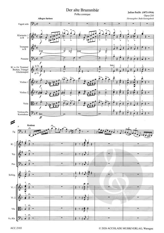 Original für Fagott und Blasorchester. Fagott solo Flöte (identisch mit 1. Klarinette) Klarinette 1, 2 Trompete Posaune Schlagzeug (Kleine und große Trommel, Becken, Triangel, Glockenspiel Violine 1,...