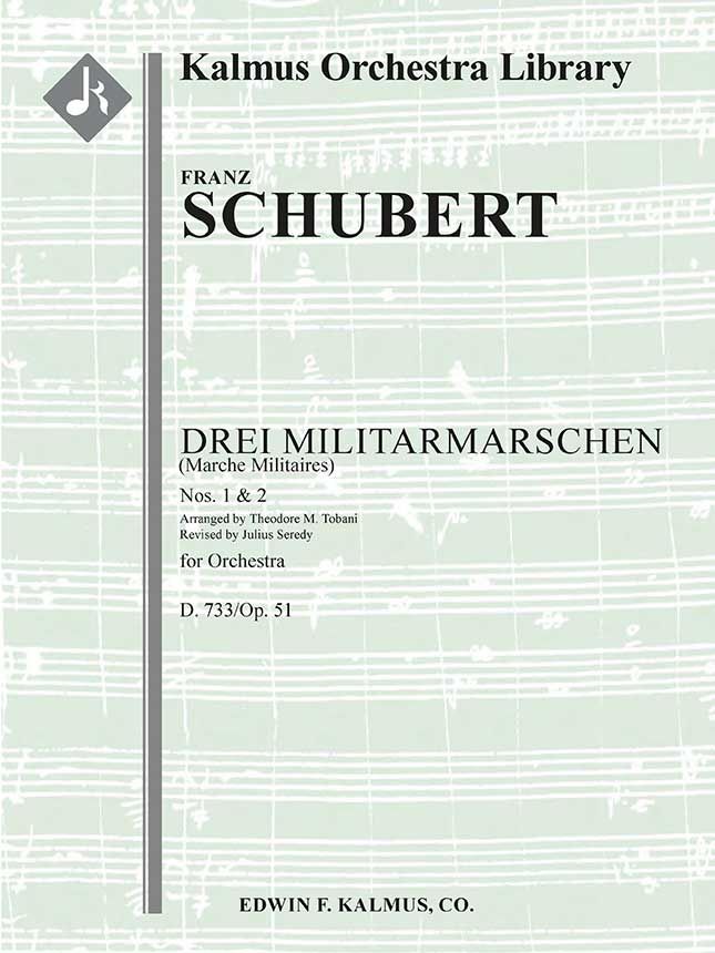 DREI MILITARMARSCHEN, op. 51, D. 733, wurden ursprünglich von Franz Schubert (1797 - 1828) während seines Aufenthalts im Sommerhaus des Grafen Johann Karl Esterházy in Zseliz, Ungarn, für Klavier zu vier Händen geschrieben. Schubert komponierte diese Werke als Lehrstücke für die Töchter des Grafen. Der Marche Militaire Nr. 1 ist das bekannteste der drei Werke. Theodore M. Tobani arrangierte die Nr. 1 und 2 für kleines Orchester, wobei Julius Seredy die Änderungen ergänzte. Besetzungen: 1.1.2.1: 2.2.1.0: Timp.Perc(2-3): Str (9.8.7.6.5 im Satz).