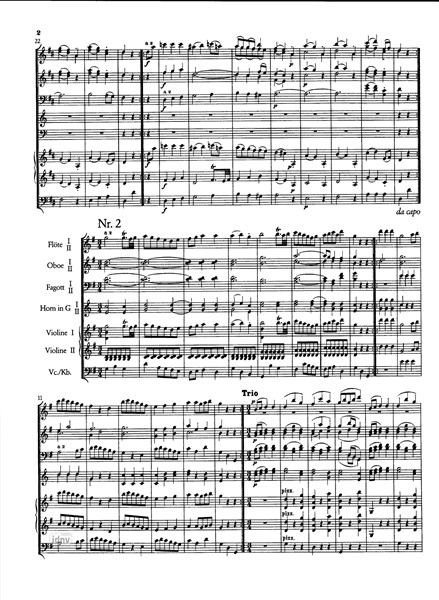 No.1: 2 Flöten, 2 Oboen, 2 Fagotte, 2 Trompeten in D, Pauken in D und A, Violine 1, Violine 2, Violoncello/Kontrabass - No.2: 2 Flöten, 2 Oboen, 2 Fagotte, 2 Hörner in G, Violine 1, Violine 2, Violoncello/Kontrabass - No.3: Piccoloflöte, 2 Oboen, 2 Fagotte, 2 Trompeten in C, Pauken in C und G, Violine 1, Violine 2, Violoncello/Kontrabass (Trio "Die Schlittenfahrt": Fagott, Schellen in A und F, Schellen in E und C, Schellen in G, Posthorn in B, Posthorn in F, Violine 1, Violine 2, Violoncello/Kontrabass)