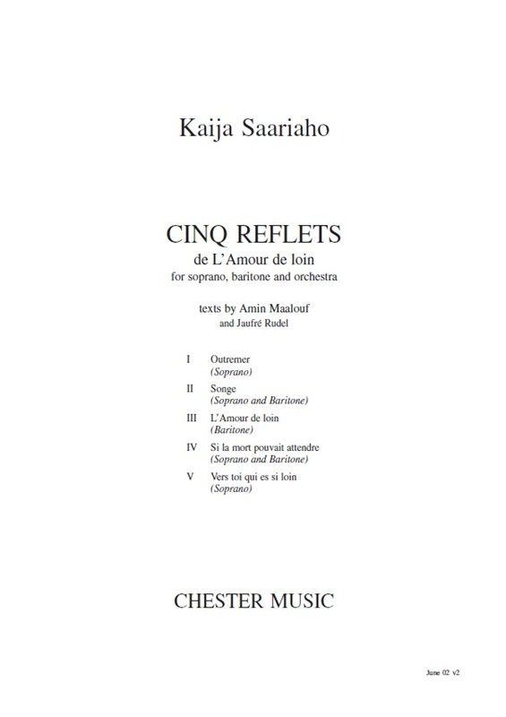 Full study score of ' Cinq Reflets De L'Amour De Loin ' by Kaija Saariaho, for Soprano, Baritone and Orchestra. Cinq Reflets was commissioned by the Royal Stockholm Philarmonic Orchestra - Stockholm Concert Hall Foundation and features texts by Amin Maalouf and Jaufré Rudel. The first performance took place on 7th November 2002 by Taina Piira (Soprano), Gerald Finley (Baritone) and the Royal Stockholm Philarmonic Orchestra conducted by Esa-Pekka Salonen.
