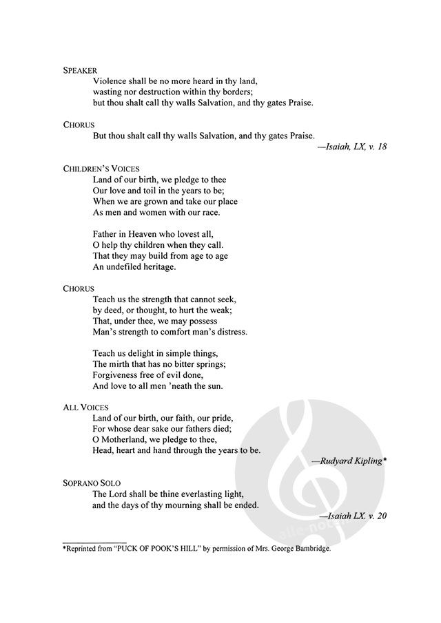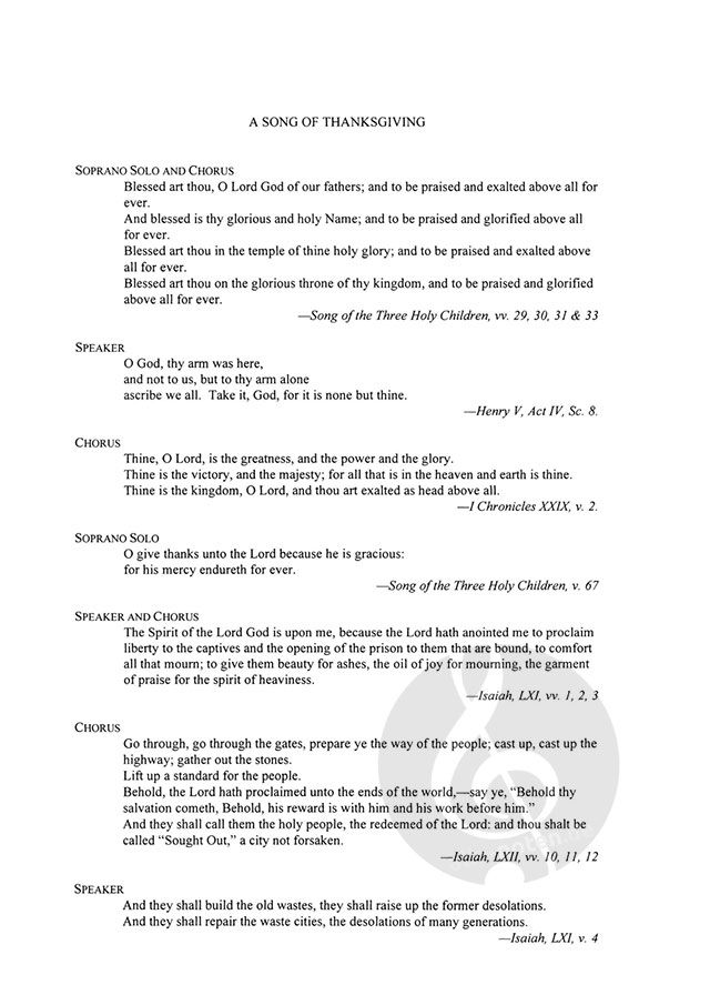 For soprano solo, speaker, SATB chorus, and full orchestra (or 3 trumpets, timpani, percussion, harp or piano, organ and strings).