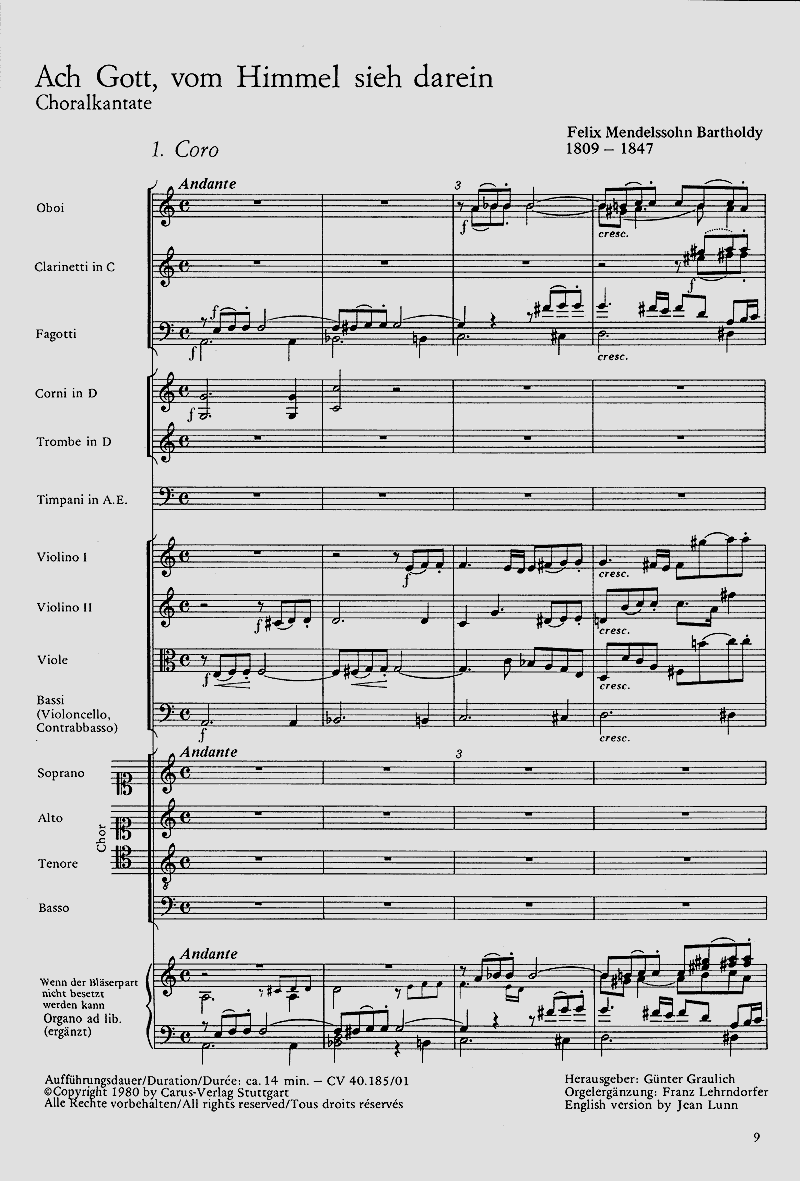 Choralkantate - Schon während Mendelssohns Lehrjahren bei Zelter hatte die Bearbeitung von Chorälen eine große Rolle gespielt, und die Beschäftigung mit dem evangelischen Choral zieht sich auch später durch sein sinfonisches und oratorisches Schaffen. Die im Zusammenhang mit der Wiederaufführung der Matthäuspassion (1829) besonders intensive Auseinandersetzung mit dem Werk Bachs führte zu einer Reihe von Kantaten über bekannte Choralweisen, die nicht nur für Kantatengottesdienste eine große Bereicherung dar stellen. Solo Bar, Coro SATB, 2 Ob, 2 Clt, 2 Fg, 2 Cor, 2 Tr, Timp, 2 Vl, Va, Vc/Cb