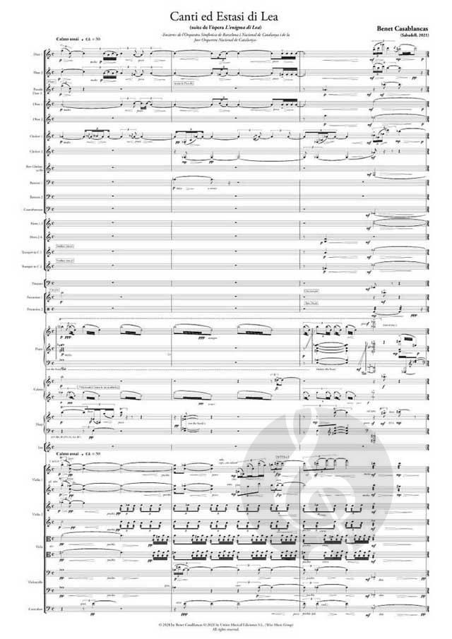 Canti ed Estasi di Lea für Sopran und Orchester (Suite aus der Oper L'enigma di Lea) sammelt und verarbeitet auf symphonische Weise einige der charakteristischsten Ausdrucksmaterialien und Umgebungen der Oper L'enigma di Lea desselben Autors, die am 9. Februar 2019 im Gran Teatre del Liceu uraufgeführt wurde, und beinhaltet einige der wichtigsten Interventionen der Protagonistin Lea, einer Rolle, die einem lyrischen Sopran anvertraut wurde. Formal und mit einer Dauer von ca. 16 Minuten ist "Canti ed Estasi di Lea" bogenförmig angelegt und besteht aus drei großen Abschnitten: Orchestereinleitung; Auftritt, Hauptarie und Tanz von Lea; und Liebesszene, Ballett (orchestraler Epilog).