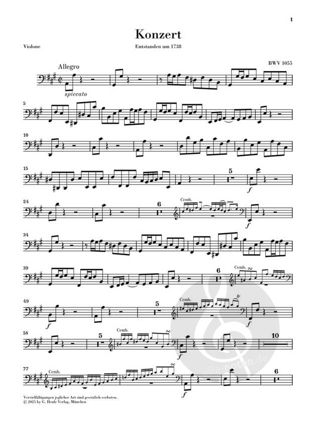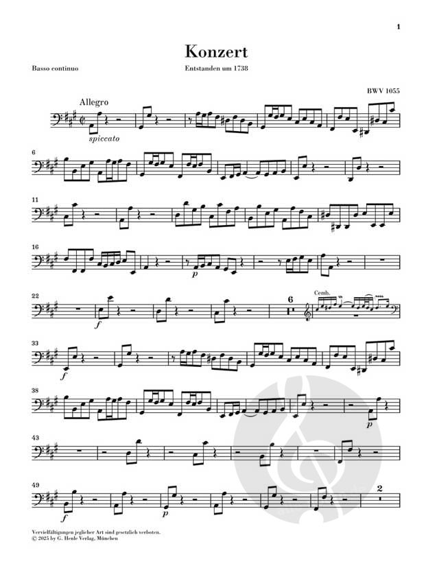 Die Cembalokonzerte von Johann Sebastian Bach sind aus dem heutigen Konzertrepertoire nicht wegzudenken. Ob das A-dur-Konzert BWV 1055 wie einige der anderen Cembalokonzerte ursprünglich für ein anderes Instrument entworfen wurde, ist unklar. In seiner Spielfreude jedenfalls klingt der Solopart wie maßgeschneidert für das Tasteninstrument. Im originalen Stimmenmaterial weist das Konzert eine Besonderheit auf: Man kann darin erkennen, dass Bach erst für spätere Aufführungen in den Tutti-Abschnitten eine Violone-Stimme (ein Streichbassinstrument) hinzufügte und die Continuostimme mit einer Generalbassbezifferung versah. Die Henle-Urtextausgabe trägt beiden Aufführungsmöglichkeiten Rechnung: Die Dirigierpartitur und die Einzelstimmen werden inklusive der beiden Stimmen-Erweiterungen vorgelegt.