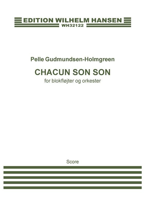 Pelle Gudmundsen-Holmgreen's Chacun Son Son for Recorder and Orchestra. Full score. This piece is dedicated to Michala Petri and the Aalborg Symfoniorkester.