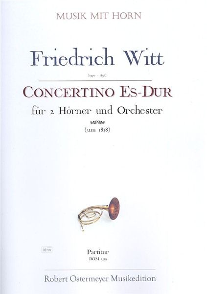 Das vorliegende Concertino für 2 Hörner reiht sich eine Anzahl von Werken für solistisches Horn, welche Witt komponierte. Für die Wallersteiner Hornisten Zwierzina und Nagel schuf er 3 Konzerte für 2 Hörner, 1795 kam ein Konzert für Horn dazu, dessen extrem anspruchsvoller Solopart für Joseph Nagel komponiert wurde. In der Sammlung des Wallersteiner Hornisten Franz Zwierzina, welche 1858 vom Fürstenhaus angekauft wurde, findet sich, neben vielen weiteren unschätzbar wertvollen Kompositionen für Horn, das vorliegende Concertino, heute aufbewahrt in der Universitätsbibliothek Augsburg. Auf dem Titel der Eintrag „… Componirt von Herrn Kapellmeister Friedrich Witt zu Würzburg“. Auf der 2. Violine der Eintrag „Concertino de F. Witt 1818“ und auf dem Titel des Basso der Eintrag „Concertino / pour / Deux Cors de Chasse“. Möglicherweise komponierte Witt dieses Werk für die Söhne der verdienstvollen Wallersteiner Hornisten - Joseph Anton Alois Zwierzina und Johannes Nagel. Belegt ist ein Auftritt dieser beiden 1805 in Wallerstein mit einem Konzert für 2 Hörner von Franz Anton Hoffmeister. Der Vermerk über das Jahr 1818 sollte hier nur als ungefähre Datierung anzusehen sein.