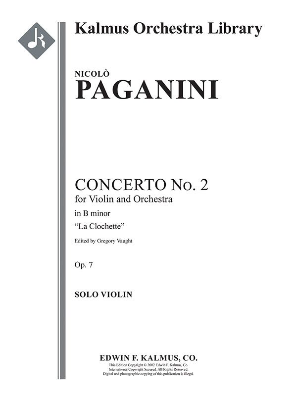 Der dritte Rondosatz von Niccolò Paganinis VIOLIN CONCERTO NO. 2 verdankt seinen Beinamen "La Clochette" oder "La Campanella" ("Die kleine Glocke") der kleinen Glocke, die vor jeder Wiederholung des Rondothemas erklingt. Die vorliegende Ausgabe von Gregory Vaught enthält transponierte Stimmen, um die Zugänglichkeit zu verbessern. Das Serpenton (Euphonium oder Tenortuba), die Pauken und die große Trommel sind optional. Instrumentierung im Satz: 2.2.2.2: 2.2.3.0: Serpentone(opt.Euph/TTuba): Timp(opt.).BsDr(opt.).Bells: Str (9-8-7-6-5 enthalten): Solo Violine.