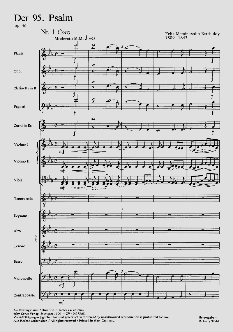 Psalmtexte inspirierten Mendelssohn während seines ganzen Schaffens, und er hinterliess neben A-cappella-Sätzen fünf große Orchesterpsalmen. Soli SST, Coro SATB, 2 Fl, 2 Ob, 2 Clt, 2 Fg, 2 Cor, 2 Tr, 3 Trb, Timp, 2 Vl, Va, Vc, Cb, Org