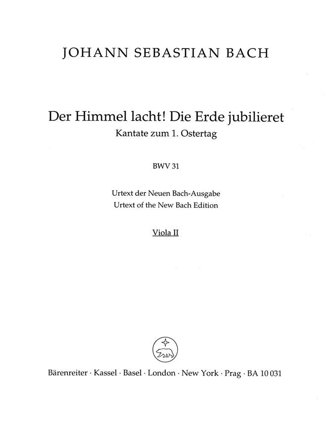 Kantate zum 1. Ostertag (Weimarer und Leipziger Fassung). Sopran solo, Tenor solo, Bass solo, Gemischter Chor-SSATB, 1 (3) Ob, (Englischhorn, Fagott), Trompete (3), Pauke, Streicher, Basso continuo