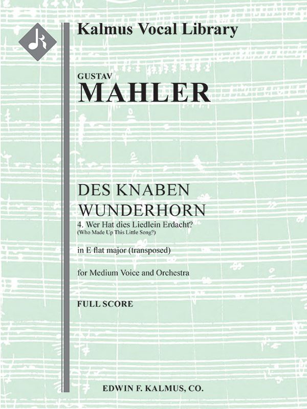 Gustav Mahler (1860-1911) began composing the songs of DES KNABEN WUNDERHORN (THE BOY'S MAGIC HORN) in 1892, finishing in 1901. Comprised of 15 songs total by the end, each sets folktale texts, as published by Achim von Arnim and Clemens Brentano, to music with piano accompaniment, though some also have orchestral accompaniment. The fourth song, WER HAT DIES LIEDLEIN ERDACHT? (WHO MADE UP THIS LITTLE SONG?), portrays a pastoral scene involving a lover's admiration for an innkeeper's daughter. The song concludes by reflecting on its own whimsical origins, having been flown across the water by a trio of geese. This Kalmus edition is transposed to E-flat major for medium voice. Instrumentation: 2.2.2.2: 2.0.0.0: Perc(1): Str (9.8.7.6.5 in set): solo voice. Reprint edition.