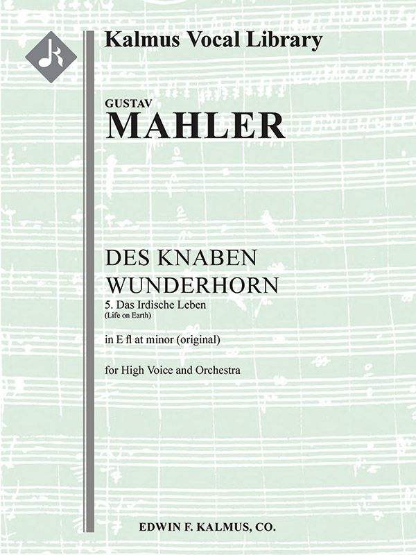 Gustav Mahler (1860-1911) began composing the songs of DES KNABEN WUNDERHORN (THE BOY'S MAGIC HORN) in 1892, finishing in 1901. Comprised of 15 songs total by the end, each sets folktale texts, as published by Achim von Arnim and Clemens Brentano, to music with piano accompaniment, though some also have orchestral accompaniment. The fifth song, DAS IRDISCHE LEBEN (LIFE ON EARTH), provides a stark contrast to the previous song due to its grim dialogue between a mother and her starving child. This Kalmus edition is presented in the original key of E-flat minor for high voice. Instrumentation: 2.2+EH.2.2: 3.1.0.0: Perc(1): Str ([4.4].[4.4].[3.3].[3.3].[2.2] in set): solo voice. Reprint edition.