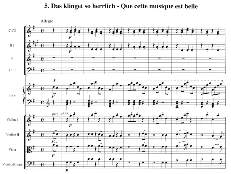 Die Suite umfasst 14 wesentliche Nummern der Oper. Schon ein kleines Ensemble mittel fortgeschrittener Streicher kann sie ausführen. Dem originalen Klang näher kommt freilich die Besetzung mit zusätzlichen Bläsern ad lib.: Flöte, Oboe bzw. 2. Flöte, Klarinette, Trompete bzw. 2. Klarinette, Horn und Fagott bzw. Posaune. Bei zwei Nummern ist auch ein Glockenspiel vorgesehen! Neu ist ein Klavierauszug, der beim Einstudieren und unterstützenden Begleiten hilft. Darüber hinaus enthält er zu 10 Nummern ergänzende Gesangspartien, die z.T. solistisch, z.T. aber auch von einem Kinder- bzw. Jugendchor ausgeführt werden können.