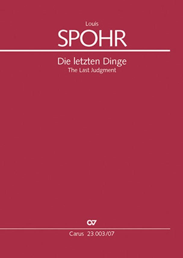 Oratorium - Zum 150. Todestag von Louis Spohr legt Carus erstmals in einer kritischen Ausgabe Die letzten Dinge, das bedeutendste seiner vier Oratorien, vor. Uraufgeführt wurde es am Karfreitag 1826 in Kassel. Zugrunde liegen die theologisch bedeutsamsten Teile der neutestamentlichen Offenbarung des Johannes, dessen Todes- und Ewigkeitsvisionen Spohr in eindringlicher Weise zu musikalischer Geltung bringt. Das Werk stellt eine wichtige Bereicherung der oratorischen Literatur insbesondere zum Ende des Kirchenjahres dar; es besticht durch meisterhafte Instrumentationstechnik, überlegen eingesetzte Chromatik, gross angelegte Solo-Rezitative und eingängige Chorpartien voller inniger Empfindsamkeit einerseits und aufwühlender Dramatik andererseits. - Solo SATB, Coro SATB, 2 Fl, 2 Ob, 2 Clt, 2 Fg, 2 Cor, 2 Tr, 3 Trb, Timp, 2 Vl, Va, Vc, Cb