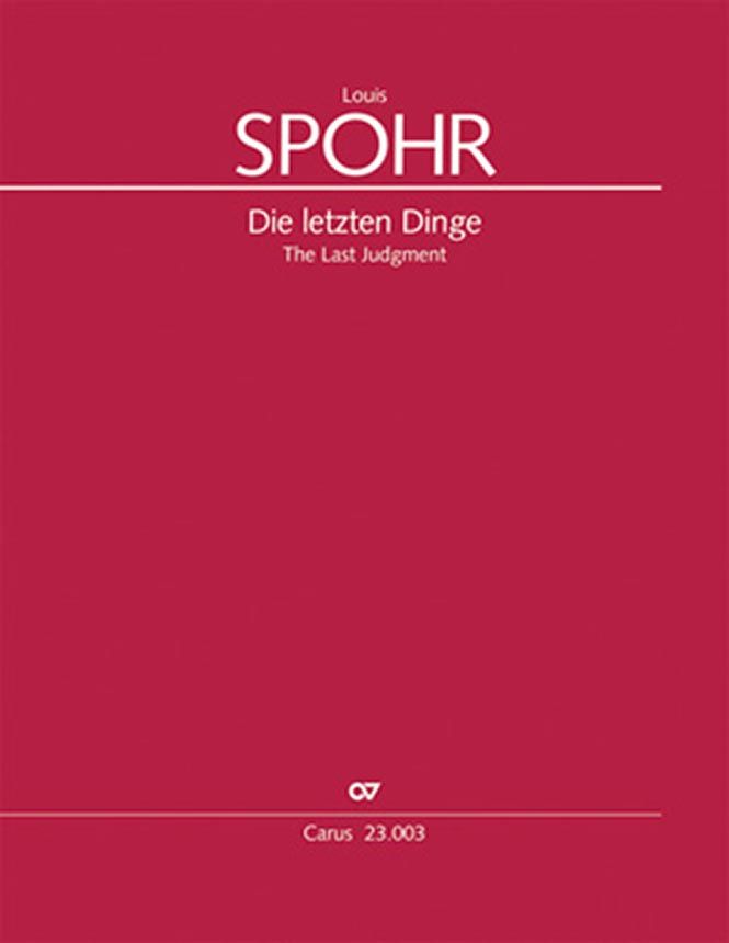 Oratorium - Zum 150. Todestag von Louis Spohr legt Carus erstmals in einer kritischen Ausgabe Die letzten Dinge, das bedeutendste seiner vier Oratorien, vor. Uraufgeführt wurde es am Karfreitag 1826 in Kassel. Zugrunde liegen die theologisch bedeutsamsten Teile der neutestamentlichen Offenbarung des Johannes, dessen Todes- und Ewigkeitsvisionen Spohr in eindringlicher Weise zu musikalischer Geltung bringt. Das Werk stellt eine wichtige Bereicherung der oratorischen Literatur insbesondere zum Ende des Kirchenjahres dar; es besticht durch meisterhafte Instrumentationstechnik, überlegen eingesetzte Chromatik, gross angelegte Solo-Rezitative und eingängige Chorpartien voller inniger Empfindsamkeit einerseits und aufwühlender Dramatik andererseits. - Solo SATB, Coro SATB, 2 Fl, 2 Ob, 2 Clt, 2 Fg, 2 Cor, 2 Tr, 3 Trb, Timp, 2 Vl, Va, Vc, Cb
