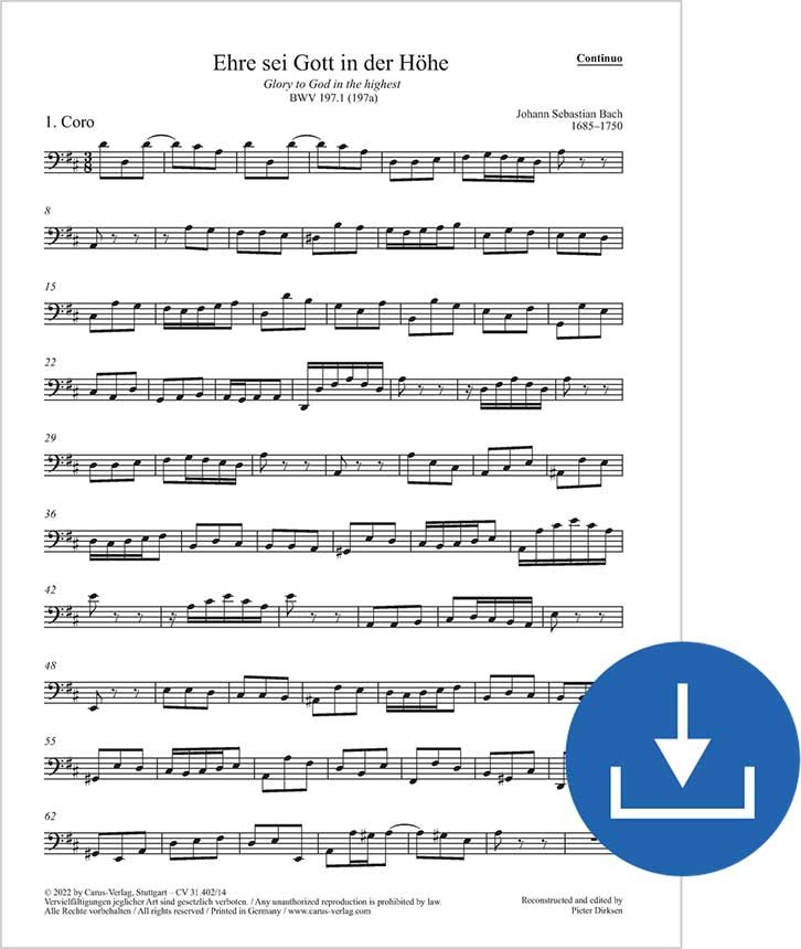 Nur der Text und der letzte Bogen der autographen Partitur sind von der Weihnachtskantate "Ehre sei Gott in der Höhe" BWV 197.1 (197a) erhalten geblieben, beginnend mit dem Schluss der 2. Arie. Diese, wie auch die vollständig erhaltene 3. Arie sind in Parodien in der Hochzeitskantate BWV 197 / BWV3 197.2 enthalten, von der die Kantate ihre BWV-Nummer bekommen hat. Für den verschollenen Eingangschor gibt es seit längerem eine spannende Theorie: Sollte es sich dabei um die Parodievorlage zum Gloria der h-Moll-Messe gehandelt haben? Der Musikwissenschaftler und Organist Pieter Dirksen ist dem nachgegangen, hat eine weitgehend aus Korrekturen im Autograph der h-Moll-Messe ableitbare vierstimmige Chorfassung erstellt und den Text des Eingangschores (die deutsche Übersetzung des Gloria) unterlegt. Entstanden ist eine überzeugende Fassung der Weihnachtskantate – mit einem der bekanntesten Chöre Bachs als prominenten Eingangschor und plausiblen Lösungen für die weiteren im Autograph fehlenden Teile. / Hierbei handelt es sich um eine Rekonstruktion der unvollständig überlieferten Weihnachtskantate BWV3 197.1. Die Trauungskantate BWV3 197.2, in die Bach 2 Sätze aus der Weihnachtskantate übernahm, ist unter Carus 31.197/50 erschienen.